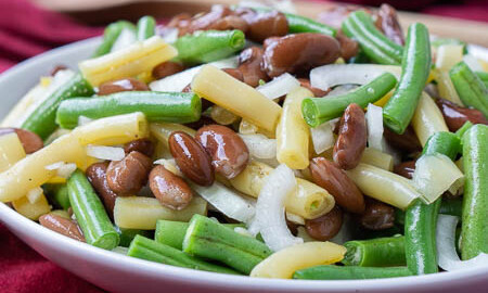 Three Bean Salad A Southern Soul - Mix together green beans, wax beans, kidney beans, onion, sugar, vinegar, vegetable oil, salt, pepper, and celery seed.
